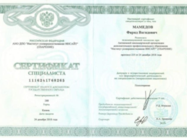 • 2018 - Повышение квалификации: Ростовский государственный медицинский университет (психиатрия);